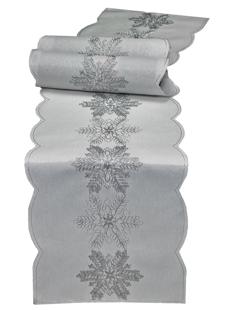 14"x72" Centre embroidered table runner with silver snowflakes and scalloped edge border.